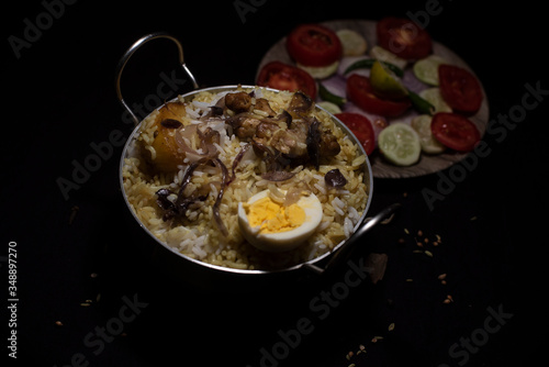 Indian spicy dish Biryani with egg, potato and Chicken in a pot along with fresh salads in dark copy space background. Food and object photography.