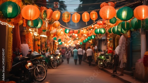 vibrant, street, decoration, india, independence, day, orange, white, green, paper, lantern, light, dusk, soft, blue, sky, warm, ambient, lighting, depth, field, festive, texture, shadow, high, end, urban, celebration, patriotism, national, pride, tricolour, atmosphere, colourful, night, scene, festivity, event, bright, glow