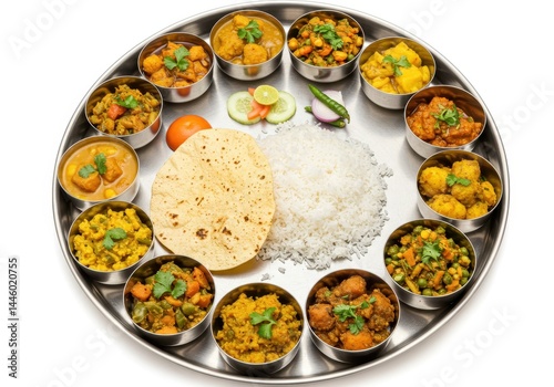 Indian thali with rice, roti, and various vegetable dishes served on a platter