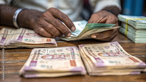 Indian town. Counting Indian rupee notes on wooden table, showcasing currency and transactions