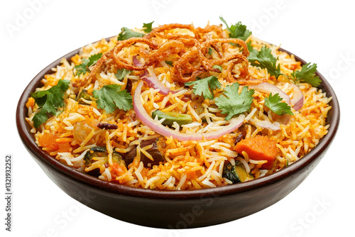 Indian Traditional Cuisine. Biryani Rice with Vegetables and Onion. transparent background, PNG, with copy space.