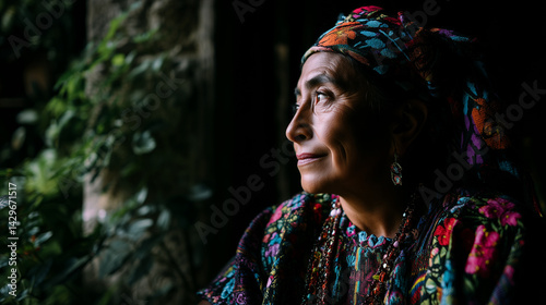 rural, ethnic, photograph, woman, traditional, indigenous, colourful, window, portrait, female, smiling, dress, headdress, floral, pattern, vibrant, textile, culture, expression, jewellery, earring, necklace, fabric, detail, indoor, thoughtful, natural light, inspiration, peaceful, serenity, mature, age, wisdom, beauty, elegance, handcraft, artistry, heritage, authenticity