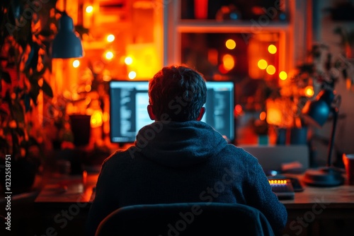 workspace, night, person, computer, screen, plant, productivity, technology, home office, coding, indoor, sharpened, solitude, work, environment, desk, chair, foliage, home, multitask, programming, concentration, relaxation, energy, inspiration, quiet, digital, routine, creativity, calmness, hobby