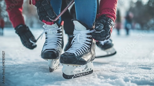 Individuals putting on ice skates on a snowy rink during winter in a lively outdoor skating area with friends and family