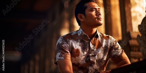 Indonesian Man in Batik Shirt Against Bali Temple Backdrop, Space for Text.