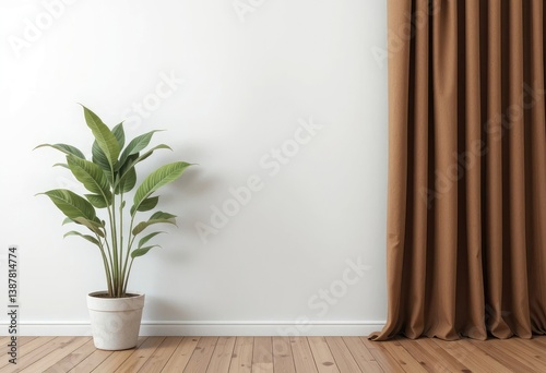 plant, potted plants, indoor, leaf, houseplant, green, growing, botany, whitewall, wall, clean, empty, minimalist, modern, home, interior, decoration, design, domestic, room, curtain, brown, window, fabric, textile, wooden floor, floor, wood, parquet, indoor, home decor, home interior, interior design