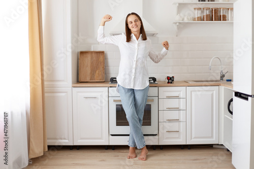 Indoor shot of young adult attractive woman wearing white shirt and jeans, standing at home against light kitchen set and stretching hands, yawning, looks sleepy.