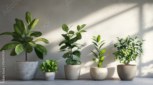 Indoor tropical plants in modern ceramic pots showcasing diverse greenery and vibrant leaves against a minimalist background with soft shadows.