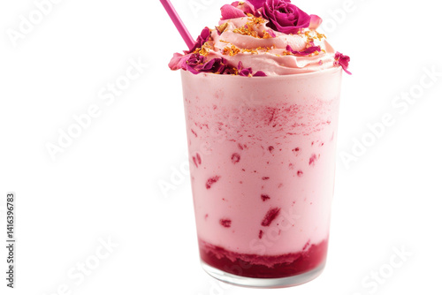 Indulge in a dreamy rose milkshake a delightful pink creamy treat topped with rose petals and a crunchy crumble perfect for a romantic on transparent background