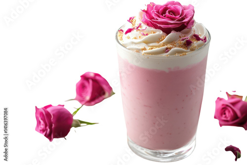 Indulge in a dreamy rose milkshake a delightful pink creamy treat topped with whipped cream rose petals and a delicate rose garnish Shot on transparent background