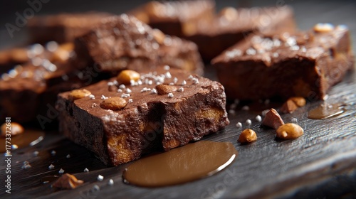 chocolate, brownie, dessert, food, sweet, treat, ingredient, nut, sea salt, rustic, closeup, delicious, baked goods, epicure, indulgence, rich, cocoa, confectionery, crispy, texture, drizzle, topping, homemade, sweetness, decadent, snack, flavorful, dark chocolate, shiny, fudge, pastry, baking, presentation, plating, warmth, comfort, cosy, tasty, handcraft, culinary arts, food photography