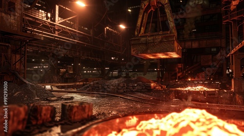 steel, metal, molten, hot, fire, industry, factory, manufacturing, production, industrial, iron, heat, weld, machine, work, crane, equipment, machinery, metallurgy, furnace, smelting, workshop, plant, building, structure, night, dark, light, red, orange, yellow, brown, grey, black, construction, metalworking, metallurgical, engineering