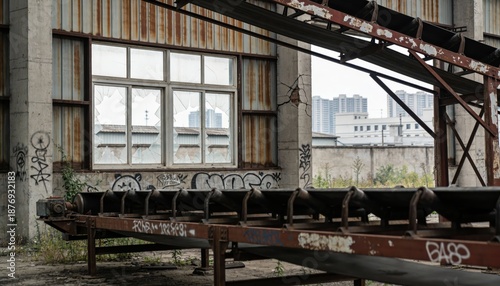industrial, abandoned, building, conveyer, belt, empty, urban, decay, warehouse, graffiti, broken, window, rust, structure, machinery, overgrown, desolation, architecture, interior, old, forgotten, equipment, derelict, construction, factory, design, transport, industry, steel, framework, site, environmental, landscape, isolation, haunting, eerie, city, background, scene, urbanisation, desolate, neglected, dereliction, remnant, history, urban decay