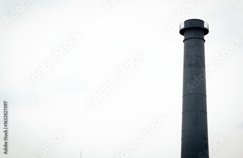 Industrial chimney rising against a cloudy sky with minimalistic and stark atmosphere