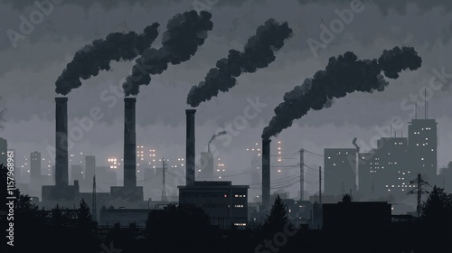 industrial, chimney, smoke, overcast, sky, urban, environment, evening, pollution, skyline, building, city, factory, atmosphere, emission, dark, air, quality, stack, industrialization, heavy, haze, manufacturing, energy, power, structure, industry, urbanisation, climate, gloomy, infrastructure, gloaming, technology, civilisation, factory, vista, landscape, development, city landscape, generative, ai