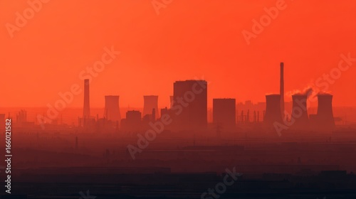 Industrial cityscape at sunrise or sunset with warm orange sky, silhouettes of cooling towers and smokestacks,