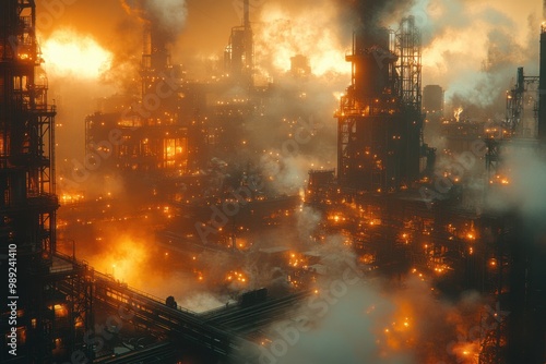 industrial, city landscape, orange, glow, misty, structure, smoke, steam, mysterious, foreboding, atmosphere, night, steel, metal, towering, factory, light, flare, pipe, refinery, silhouette, dark, dense, futuristic, urban, landscape, industrialized, polluted, industrialism, smog, sky, cloud, hazy, aerial