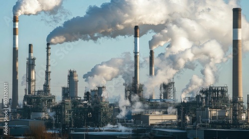 industry, refinery, smokestack, pollution, factory, industrial, manufacturing, production, emission, environment, climate, change, global, warming, energy, power, plant, steel, pipe, infrastructure, complex, landscape, city landscape, smoke, cloud, air, contamination, carbon, footprint, ecology