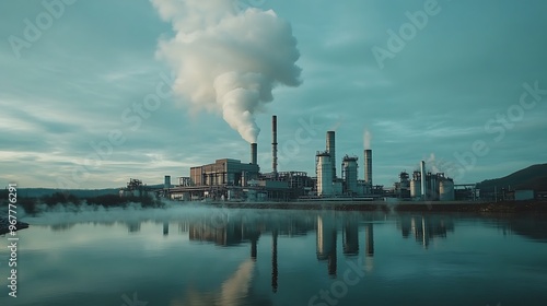 factory, industrial, complex, building, smog, pollution, environment, water, lake, river, sky, cloud, landscape, nature, industrialization, chimney, smokestack, industry, power, plant, steel, concrete, infrastructure, urban, development, rural, calm, serenity, mist, fog, horizon, blue, grey, green, morning, daytime, wide, angle, photo, photo