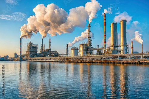 smoke, plume, industrial, complex, factory, plant, refinery, water, blue, sky, cloud, white, horizon, sunset, dusk, evening, morning, dawn, sunrise, industrialization, pollution, environment, city landscape, landscape, building, structure, steel, metal, tower, chimney, pipe, machinery, infrastructure, energy, power, production, manufacturing, processing, chemical, oil, gas, petrochemical, urban, city, waterfront, river, harbor
