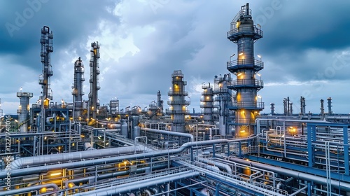 Industrial complex with towering structures and illuminated pipelines under a cloudy sky