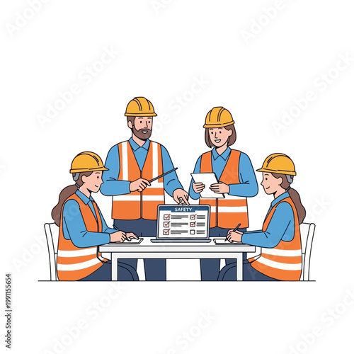 Industrial Construction Workers Safety Meeting and Training Illustration with Digital Checklist on Laptop