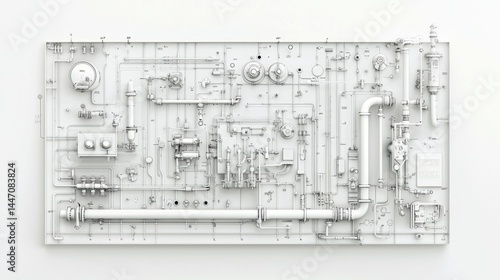 Industrial control panel design showcasing intricate piping and instrumentation layout in a clean, minimalist style
