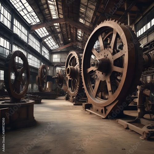 Industrial Elegance: Gigantic Gears in an Abandoned, Light-Filled Factory Interior