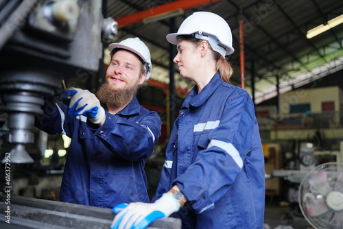 Industrial Engineer at work in factory, industrial engineers working at automated AI robotic production factory - New technology concept