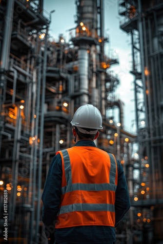 engineer, oil, gas, energy, industry, industrial, men at work, safety, helmet, vest, inspection, refinery, power, fuel, production, plant, pipeline, chemical, manufacturing, construction, occupation, professional, job, power plant, crude oil, natural gas, fossil fuel, resource, infrastructure, technology, equipment, metal, steel, outdoors, sunset, dusk, back, backview