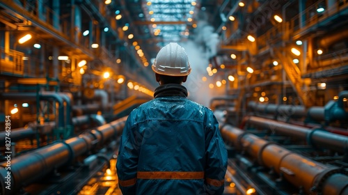 Industrial engineer. Rear view of an industrial engineer in hard hat and jacket surveying the manufacturing operations on a factory floor.