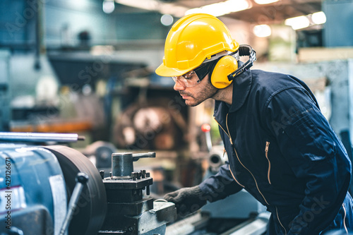 Industrial Engineers in Hard Hats.Work at the Heavy Industry Manufacturing Factory.industrial worker indoors in factory. man working in an industrial factory.Safety first concept.