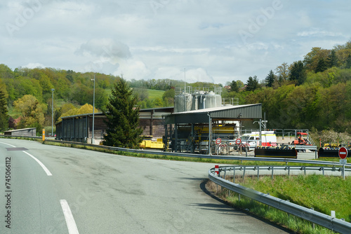 roadway, warehouse, spring, cloudy sky, green tree, early spring, industrial complex, nature, industry, traffic sign, guard rail, asphalt, transportation, infrastructure, manufacturing, tank, building, vegetation, season, cloud, overcast, sky, landscape, rural, foliage, growth, renewal, truck, business, commerce, production, environment