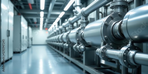 Industrial Facility Row of Sleek Metal Pipes and Machinery in a Modern Setting