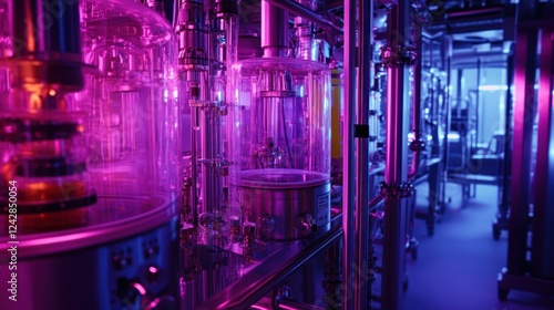 distillation, industrial, facility, process, equipment, vibrant, illuminated, background, operation, technology, manufacturing, production, science, chemistry, laboratory, factory, plant, refinery, engineering, innovation, research, development, experiment, future, progress, modern, advanced, clean, sterile, precise, efficient, automated, sophisticated, complex, intricate, system, pipe, tank, glasses, metal, purple, pink, blue, light, glow, energy