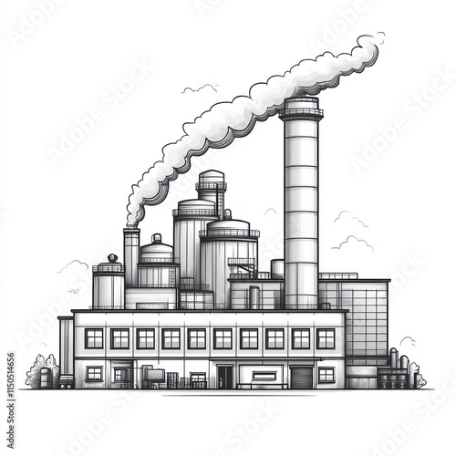 factory, building, industrial, smoke, chimney, tall, pollution, emission, plant, manufacturing, production, industry, complex, structure, architecture, design, engineering, infrastructure, silhouette, vignetting, drawing, illustration, graphic, artwork, image, visual, representation, line, art, style, black, white, greyscale, monochrome, background, simple, modern, contemporary, energy, power, technology, environment, landscape, urban