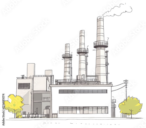 cute, building, sticker, cut-out, factory, industrial, chimney, smoke, vignetting, illustration, drawing, architecture, design, power, plant, energy, production, manufacturing, infrastructure, industry, technology, tall, structure, urban, landscape, tree, leaf, yellow, green, line, white, grey, black, background, image, graphic, art, visual, style, modern, city, scene, environment, pollution, emission