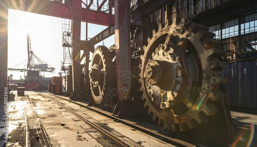 industrial, machinery, gear, sunlight, port, terminal, shipping, cargo, transportation, infrastructure, heavy, metal, equipment, wheel, urban, engineering, logistic, delivery, power, work, manufacturing, technology, modern, factory, industry, construction, mechanical, harbor, maritime, scene, coast, seaport, load, dropped, landscape, structure, detail, shadow, exterior, environment, operational, system, design, background, urbanisation, business, ship, activity, process