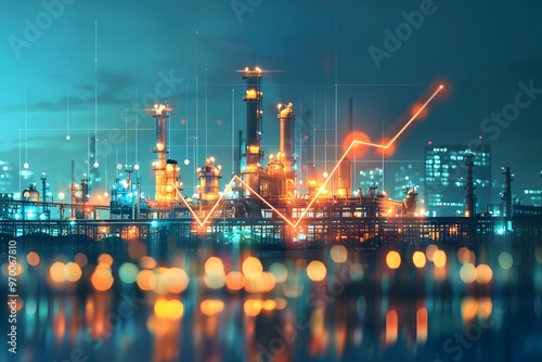 Industrial Growth: A Night View of Oil Refinery with Data Visualization