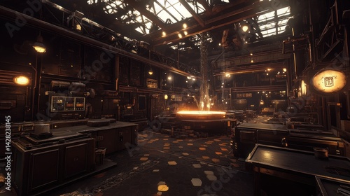 factory, industrial, metal, molten, fountain, machinery, interior, steel, workplace, building, construction, infrastructure, manufacturing, production, automation, technology, engineering, design, structure, architecture, workshop, room, light, shadow, dark, contrast, texture, detail, rust-eaten, pipe, beam, grating, ceiling, floor, surface, glasses, glow, heat, steam, bright, reflective, art