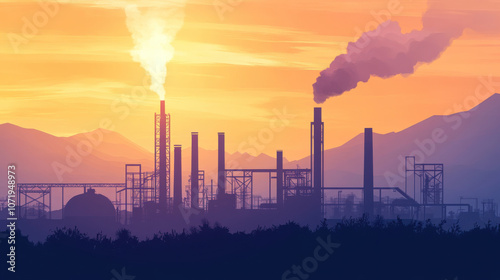 Industrial landscape at sunset with smokestacks and steam. silhouette of manufacturing plant is visible against colorful sky, creating dramatic atmosphere