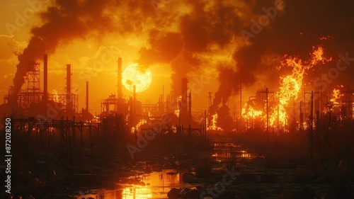 Industrial landscape with smoke and fire, depicting pollution and environmental crisis during sunset.