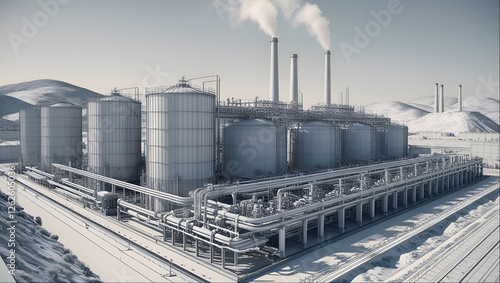 gas, natural, fuel, tank, refinery, storage, plant, liquid, industrial, industry, factory, infrastructure, three-dimensional, wireframe, petrochemical, pollution, oil, business, model, facility, pipe, steel, drawing, metal, structure, complex, engineering, design, technology, manufacturing, production, chemical, crude, energy, power, processing, distillation, machinery, platform, scaffolding, intricate, draft, detail, background, illustration, rendering, smoke, smog