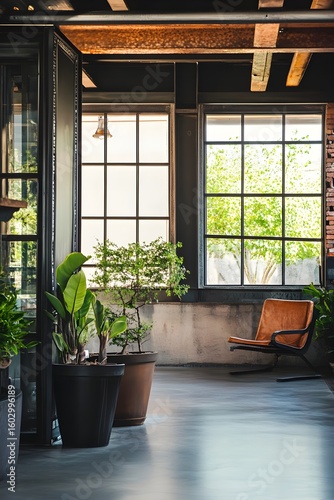 industrial, loft, apartment, plant, chair, greenery, interior, design, home decor, modern, minimalist, roomy, bright, sunlight, rustic, chic, stylish, comfortable, relaxing, peaceful, calm, workspace, living room