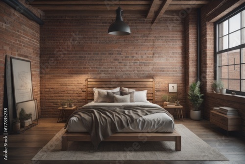 Industrial loft interior design of modern bedroom. Wooden bed near brick wall