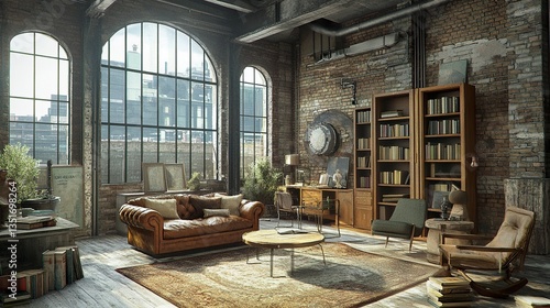 Industrial loft interior with exposed brick walls, modern furniture, metallic accents, and large floor-to-ceiling windows, bathed in natural light, wide shot.