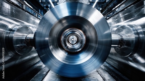 Industrial machine spinning aluminum wheel with motion blur, engineering concept