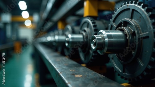 Industrial Machinery Close-up A Detailed View of Precision-Engineered Gears and Shafts in a Manufacturing Facility