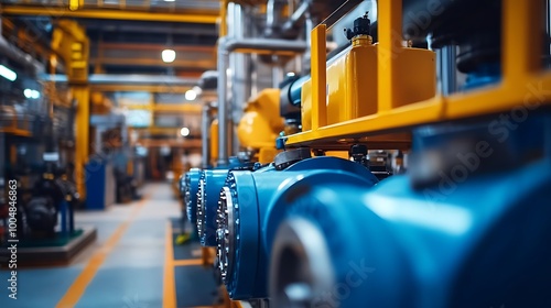 industrial, machinery, factory, blue, yellow, metal, pipe, equipment, steel, production, manufacturing, engineering, technology, automation, work, workshop, process, heavy, industry, power, part, gear, bolt, component, close, up, detail, sharpened, background, blur, bright, light, clean, modern, organised, structure, assembly, system