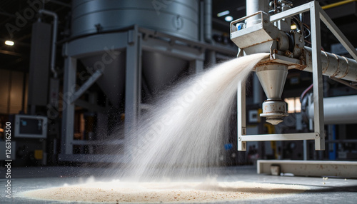 Industrial machinery pouring flour, dynamic movement, manufacturing process, factory setting, copy space